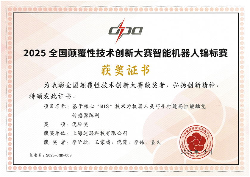 近日,由京津冀国家技术创新中心主办、上海及广州等分中心联合承办的第四届”全国颠覆性技术创新大赛”(以下简称”大赛”)及2025全国颠覆性技术创新大赛智能机器人锦标赛(以下简称”智能机器人锦标赛”)相继落下帷幕。上海迷思科技有限公司凭借两项突破性技术成果,在全国超2500个参赛项目中崭露头角,连续斩获两项重量级优胜奖。